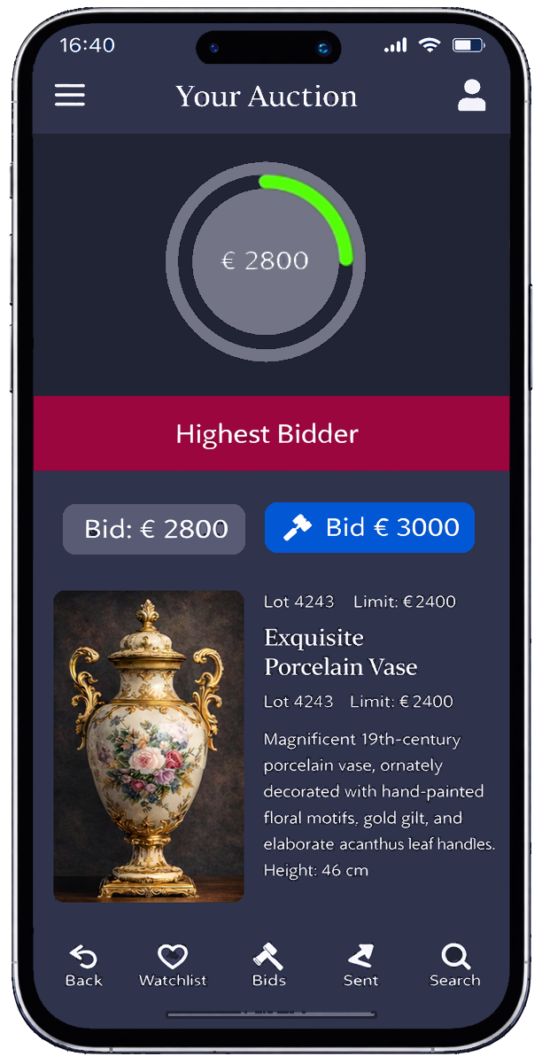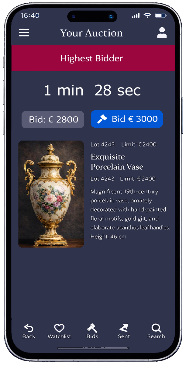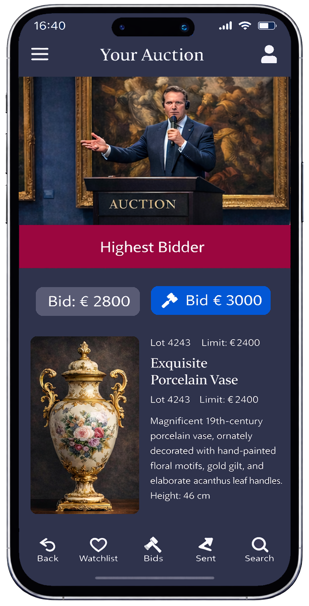 Optional: App-Funktionen wie Merklisten, Live-Bieten, Rechnungen, Sendungs-Tracking und personalisierte Push-Alerts.